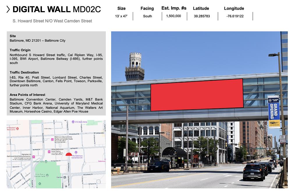 This completely new, double sided digital structure delivers unmatched impressions for Camden Yards/ The Baltimore Convention Center and the Hilton Inner Harbor. Control the conversation in this high demand area!